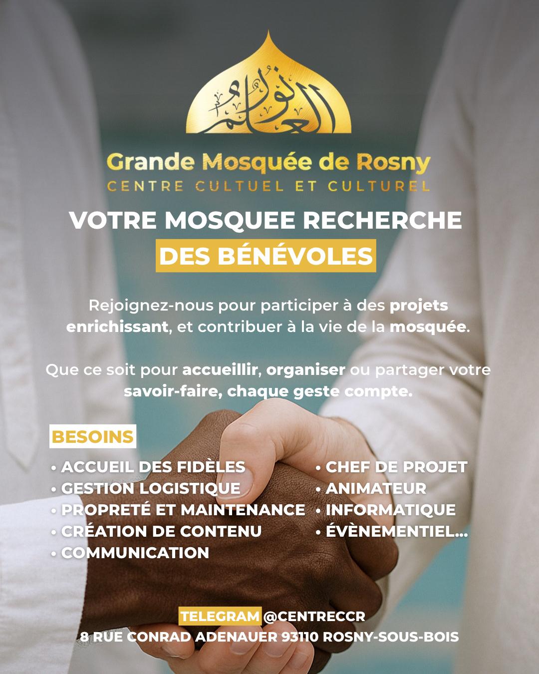 Le 13 avril 2013, la première pierre de la Grande Mosquée de Rosny fut posée. Ce geste symbolique marquait le début d’une aventure humaine et spirituelle. Avec seulement 800 000 euros pour un projet estimé à 6 millions, tout semblait impossible. Et pourtant ... portée par la foi, la générosité des donateurs et l’engagement sans faille des bénévoles, la mosquée a vu le jour. Elle s’est construite pierre après pierre, cœur après cœur, pour devenir bien plus qu’un lieu de culte : un espace de paix, de savoir et de rassemblement pour toute une communauté.